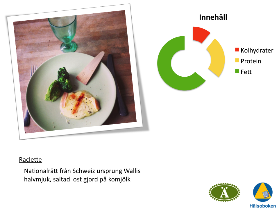 Raclette är en maträtt med ursprung i delar av Schweiz. Den runda Raclette osten är uppvärmd, antingen framför en eld eller med en speciell maskin, och skrapas sedan ned på tallriken. Termen raclette kommer från det franska ordet racler , som betyder ” att skrapa ”, en hänvisning till det faktum att den smält ost måste skrapas från osmälta delen av osten på plattan. Traditionellt smältningen sker framför en öppen eld med stor bit ost mot värmen . En sedan regelbundet skrapar bort smältsidan. Det åtföljs av små fasta potatisar ( Bintje , Charlotte eller Raclette sorter) , gurkor , syltlök och torkat kött , till exempel jambon cru / cuit och viande des Graubünden. I den schweiziska kantonen Valais är raclette vanligtvis serveras med te eller andra varma drycker . Ett annat populärt alternativ är att servera raclette med vitt vin , till exempel den traditionella Savoy vin eller Fendant , men Riesling och Pinot gris är också vanliga . Lokal tradition varnar att andra drycker – vatten till exempel – kommer att orsaka osten att hårdna i magen , vilket leder till matsmältningsbesvär. Raclette nämndes i medeltida skrifter , i texter från Swiss – tyska kloster med anor från så långt som 1291 , [ 2 ] som en särskilt näringsrik måltid konsumeras av bönder i bergiga Schweiz och Frankrike ( Savojen region ) . Det var då känd i den tysktalande delen av Schweiz som Bratchäs , eller ” rostad ost . ” Traditionellt de schweiziska ko herdar brukade ta osten med dem när de flyttar korna till eller från betesmarkerna uppe i bergen . På kvällarna runt lägerelden , skulle de placera osten bredvid elden och när den hade nått den perfekta mjukhet , skrapa den på toppen av bröd . Ett modernt sätt att tjäna raclette innebär en elektrisk bords grill med små kastruller , kallas coupelles , på sig att smälta skivor raclette ost . Generellt är grillen krönt med en värmeplatta eller grillpanna . Osten kommer till bordet skivade , tillsammans med skivorna på kokt eller kokt potatis , andra grönsaker och charkuterier . Dessa är sedan blandas med potatis och toppad med ost i de små , kilformade coupelles som placeras under grillen för att smälta och bruna osten . Alternativt kan skivor ost smältas och helt enkelt hälls över maten på tallriken. Tyngdpunkten i raclette middag är på avslappnad och sällskaplig äta och dricka , måltiden pågår ofta i flera timmar . Franska och andra europeiska stormarknader har generellt både grillen och färdig skivad ost, särskilt runt jul . Restauranger ger också raclette kvällar för grupper av middagsgäster.