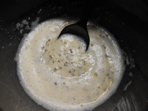 - Smält smöret i kastrullen. Blanda sedan i vätskan och värm till 37 grader (brukar kännas som fingervarmt).