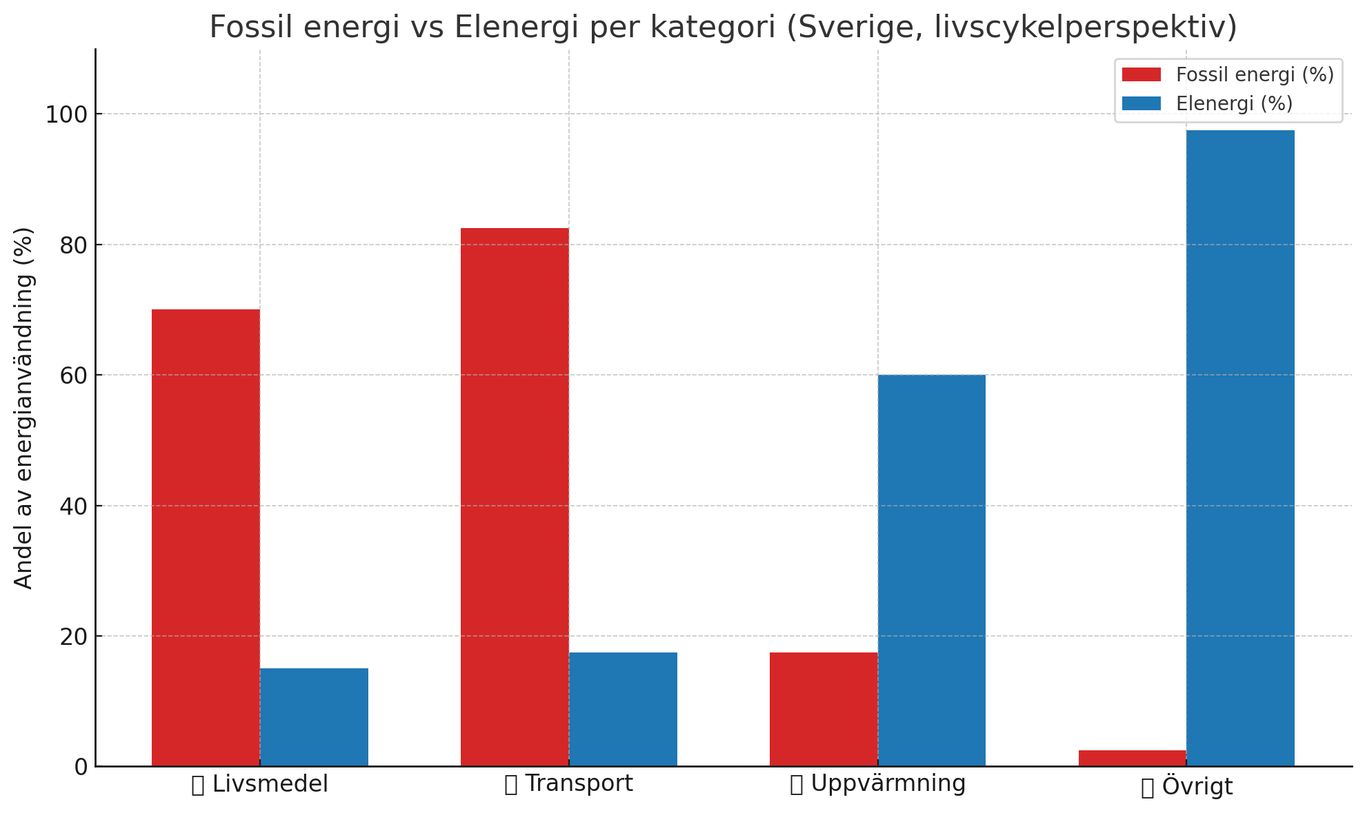 - Livsmedel domineras av fossil energi, främst från jordbruk och transporter.